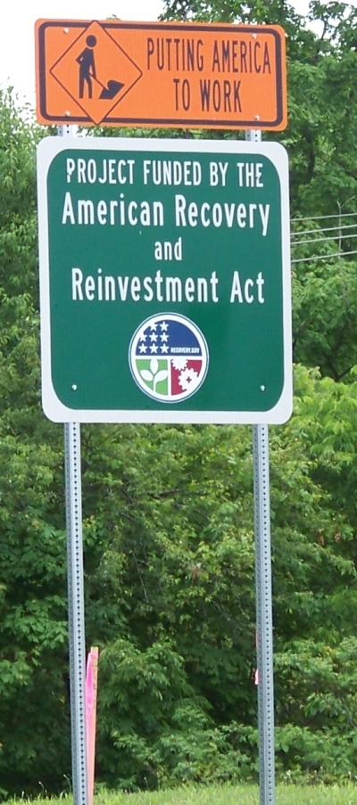 The sign to the right sits near the intersection of Rockport Road and Tapp Road, conveniently placed where traffic backs up at the stop sign to remind people that Barack Obama's "economic stimulus" package was used to pay for the "improvements" to the area.